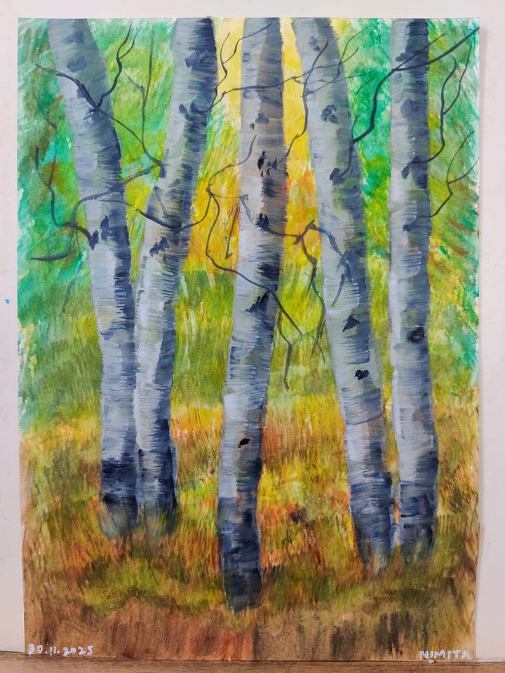 Lovely to get to know you better, Nimita. I’ve really enjoyed seeing your art in my feed. The birch trees and First Indulgence were my introduction to your work. ✨🦋✨