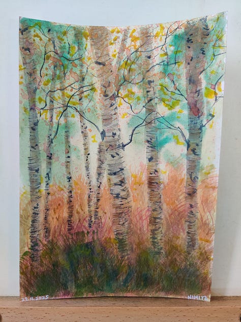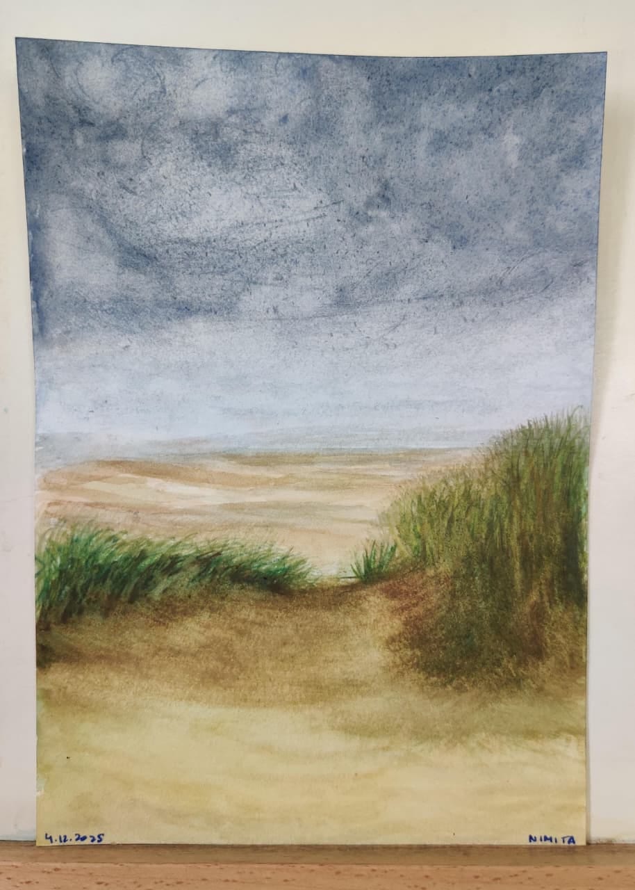 Nimita: Third image is inspired by beautiful photographs of Mark Cornick on Substack of grasses and sand dunes. I struggled with this the most, especially with the sky. There were 6 photos, but this one is my favourite. I ended up changing a lot while creating it with watercolours, and went with my instinct and loved the final result.